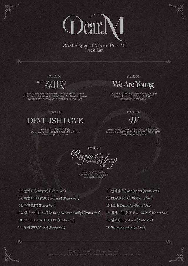 원어스(서호, 이도, 건희, 환웅, 시온)는 오늘(6일) 0시 공식 SNS에 스페셜 앨범 ’Dear.M(디어.엠)‘의 트랙리스트를 공개했다. 이에 따르면 ’Dear.M‘에는 타이틀곡 ’IKUK‘를 포함해 ’We Are Young‘, ’DEVILISH LOVE‘, ’W‘ 등 신곡 4곡과 지난해 12월 발매된 팬송 ’루퍼트의 눈물 (Rupert‘s drop)’이 수록된다.