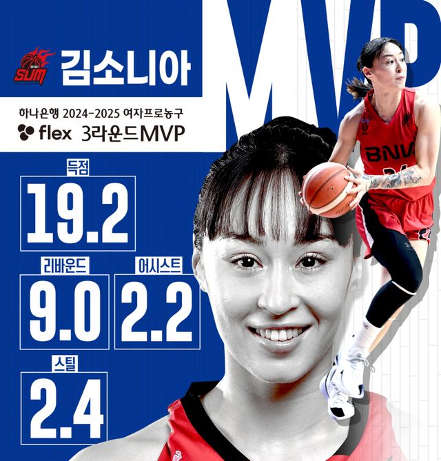 한국여자농구연맹(WKBL)은 2024~25 여자프로농구 3라운드 MVP와 기량발전선수(MIP)로 김소니아와 이명관(우리은행)이 선정됐다고 발표했다.