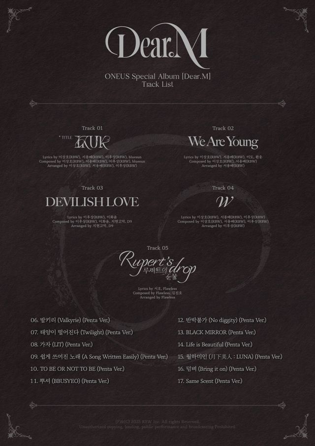 트랙리스트에 따르면 ‘디어. 엠’에는 타이틀곡 ‘IKUK’를 포함해 ‘We Are Young’, ‘DEVILISH LOVE’, ‘W’ 등 신곡 4곡과 지난해 12월 발매된 팬송 ‘루퍼트의 눈물’이 수록된다.