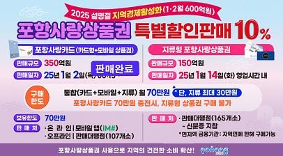 시는 올해 처음으로 발행한 포항사랑카드의 빠른 완판과 오는 14일 발행 예정인 지류형 포항사랑상품권 할인 판매로 지역경제에 자금이 도는 선순환 구조를 마련해 위축된 골목상권에 소비 기폭제가 될 것으로 기대하고 있다.