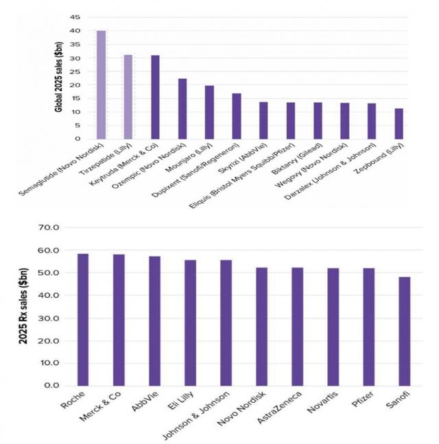 일라이 릴리는 지난해 전문의약품 매출액 기준 11위를 기록했으나 올해는 4위로 올라설 것으로 예상되고, 노보노디스크는 작년 10위에서 올해 6위로 상승할 것으로 보인다.
