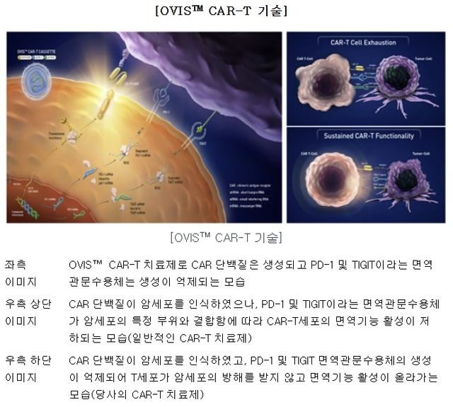 실제 해당 기술이 적용된 CD19 표적 CAR-T 임상에서 PD-1 발현은 평균 70% 억제됐고, TIGIT 발현은 평균 90% 억제됐다. CAR-T 기술과 면역관문억제제 기술을 융합한 것은 OVIS가 최초로, 현재 20여개국에 특허 출원 중이다.