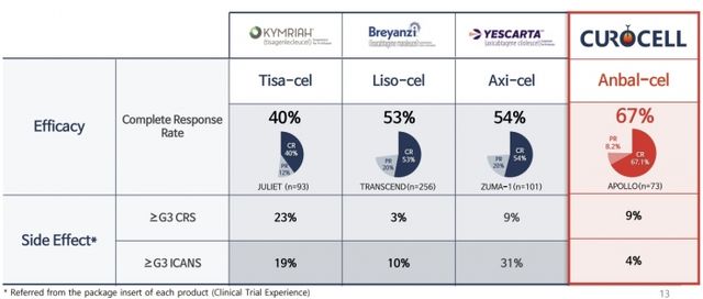 임상시험의 성공여부를 판단하는 일차 평가변수인 객관적반응률(ORR)은 75.3%로 나타나 기존 치료제(킴리아) 대비 우수한 데이터를 확인했다. 안전성 또한 기존 치료제보다 우수했다.