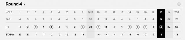 히데키는 이글 1개, 버디 7개, 보기 1개로 8타를 줄여 합계 35언더파 257타를 쳐 모리카와를 3타 차로 제치고 정상에 올랐다. 우승상금 360만 달러(약 53억원).