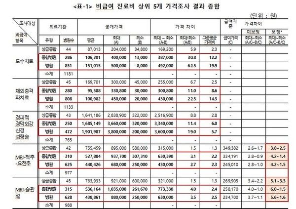 이번 경실련 조사 대상은 ▲도수치료 ▲MRI-척추-요천추 ▲체외충격파 ▲경피적 경막외강 신경성형술 ▲MRI-근골격계-슬관절 등 전체 비급여 진료비 상위 5개항목으로, 경실련은 종별 병원간 가격 격차를 살펴봤다. 지난해 9월 기준 건강보험심사평가원에서 공개한 비급여진료비 정보를 바탕으로 이뤄진 분석이다.