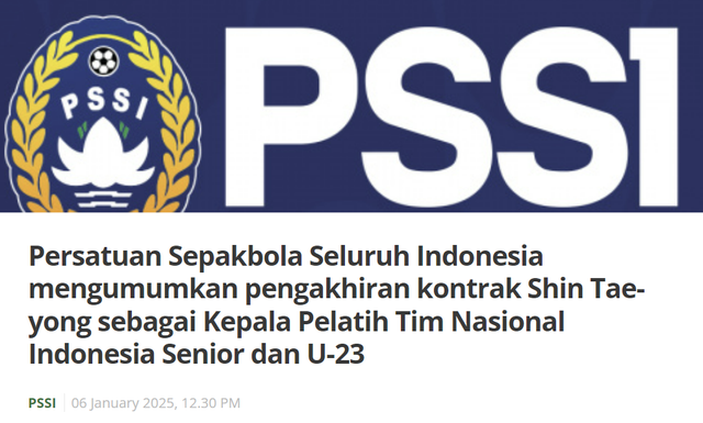 인도네시아축구협회가 6일(한국시간) 공식 홈페이지를 통해 신태용 인도네시아 축구대표팀 및 23세 이하(U-23) 축구대표팀 감독과의 계약을 해지하기로 결정했다고 발표했다.