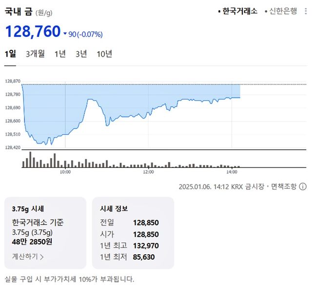 국내 금시세(금값)가 6일 오후 하락세(전 거래일 대비)를 보이고 있다.