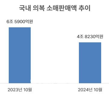 6일 한국섬유산업연합회에 따르면 지난해 10월 기준 국내 의복 소매 판매액은 4조 8230억원으로 전년 동기대비 30% 감소했다. 지난해 1월부터 10월까지 누계 판매액은 53조 580억원으로 전년 동기대비 4% 줄었다. 2021년(16%↑), 2022년(7%↑), 2023년(7%↑) 등 최근 지속적으로 증가해온 연간 의복 판매액이 감소세로 전환됐을 가능성이 높아졌다.