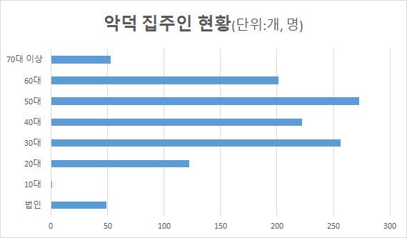 보증금을 갚지 않은 집주인을 연령대별로 보면 50대가 273명으로 가장 많았고, 30대(256명), 40대(222명), 60대(201명), 20대(122명), 70대 이상(53명) 순으로 집계됐다.