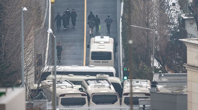 윤석열 대통령의 체포영장 유효기간 만료일인 6일 서울 용산구 한남동 대통령 관저 입구가 버스들로 가로막혀 있다. 이날 경찰은 윤 대통령에 대한 체포영장을 재집행할 때 대통령경호처(경호처) 직원들이 또다시 저지할 경우 체포하는 방안을 검토 중이라고 밝혔다. / 연합뉴스