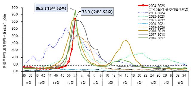 질병관리청이 운영하는 의원급(300개소) 인플루엔자 표본감시 결과, 최근 4주간 인플루엔자 의사환자 발생이 지속 증가하고 있는 것으로 나타났다. 2024년 52주차(12.22.~12.28.)에 외래환자 1000명당 73.9명으로 51주차(12.15.~12.21.) 대비 136% 증가했다. 독감 의사환자가 1000명당 73명을 넘은 적은 2016년(86.2명) 이후 처음이다.
