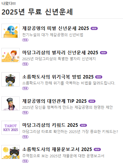 또한, '냉정하고 솔직한 쪽집게 감정', '후련한 토정비결', '출사표 비책', '타로 예지', '핵심 분석' 등 재미있게 점칠 수 있는 다양한 신년운세 상품도 준비되어 있다.