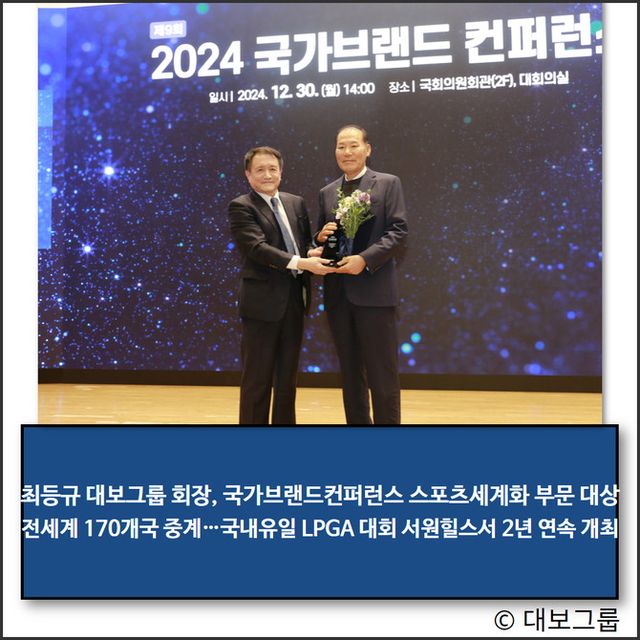 최등규 대보그룹 회장이 최근 서울 국회의원회관 대회의실에서 개최된 '2024 국가브랜드컨퍼런스'에서 스포츠 세계화 부문 국가브랜드 대상을 수상했다.