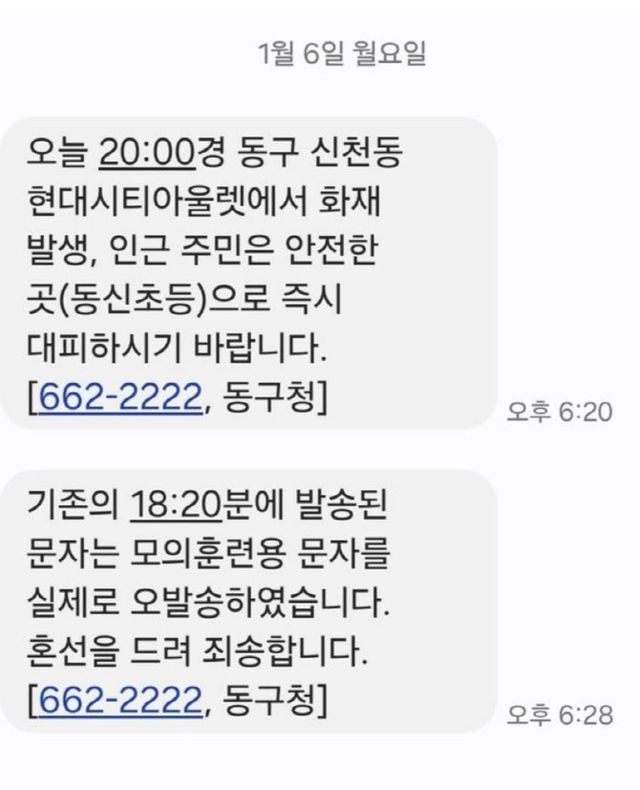 동구는 “모의 훈련 중 실수를 했다”며 시민들에게 사과 뜻을 전했다.