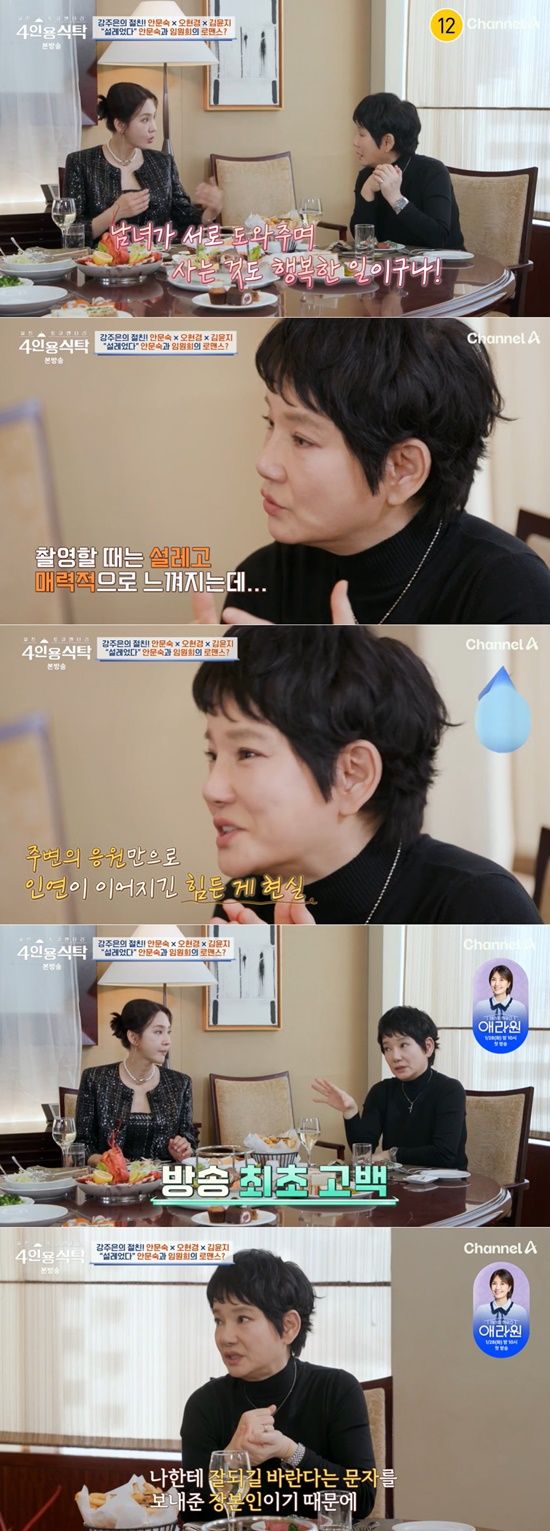 강주은은 "두 사람의 진정한 이야기가 알고 싶다"고 물었고, 안문숙은 "그 방송 후 스토리를 '4인용식탁'에서 얘기할 줄 몰랐다"고 의미심장하게 말문을 열었다.