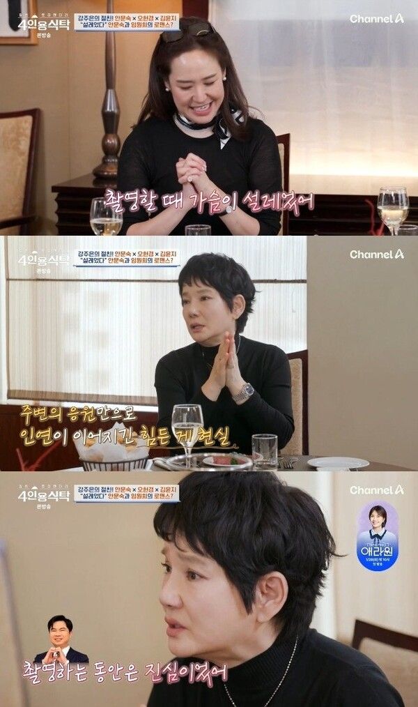 6일 방송된 채널A '절친 토큐멘터리 4인용식탁'에서 안문숙은 강주은, 오현경, 김윤지와 함께 '미우새'에서 임원희와의 러브라인에 대한 이야기를 나눴다. 강주은은 남편 최민수와 함께 안문숙과 임원희를 응원하는 문자를 보냈다고 밝히며 두 사람의 관계에 대한 기대감을 드러냈다.