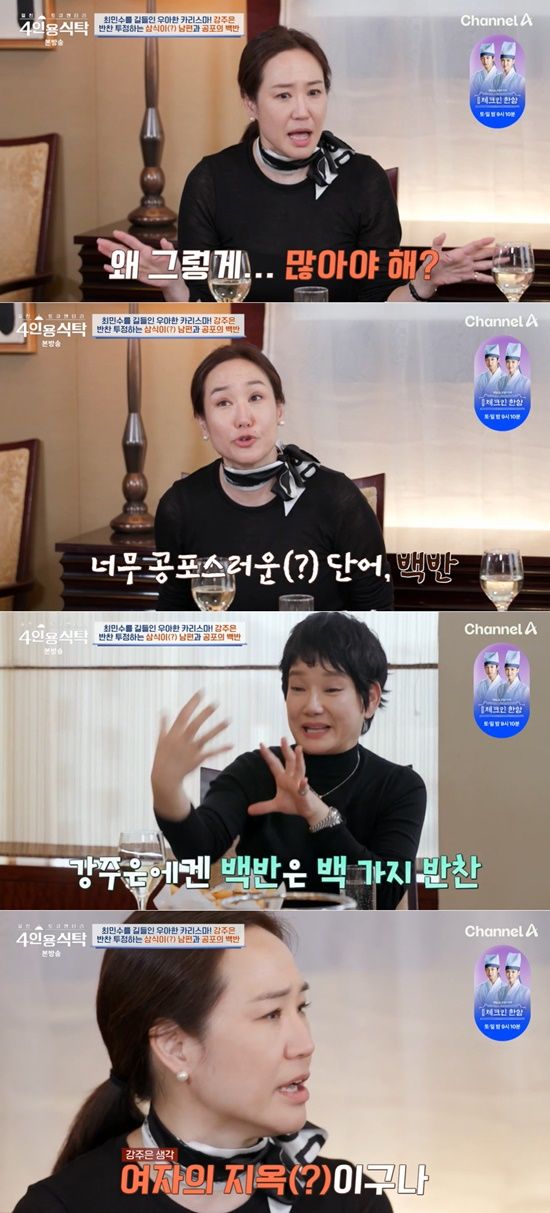 이에 오현경이 "반찬수가 좀 많냐"고 공감하자 강주은은 "왜 그렇게 많아야 하냐. 백반이라는 징그러운 단어가 어디 있냐. 너무 공포스럽다. 누가 백 가지 반찬을 만드냐"고 쏟아내 모두를 폭소케 만들었다.