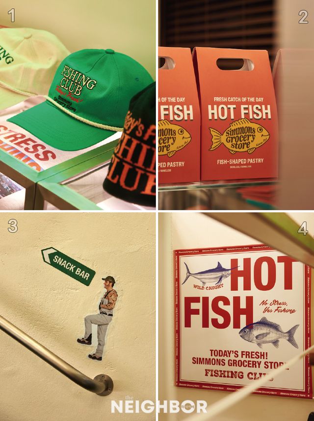 1 낚시와 어울리도록 디자인한 볼캡. 2 붕어빵을 담는 포장용 패키지. ‘핫 피시’라는 문구에서 지금의 콘셉트가 탄생했다. 3 2층으로 오르는 방향을 가리키는 스티커. 밈의 요소를 활용했다. 4 계단 벽에 부착된 빈티지한 포스터.