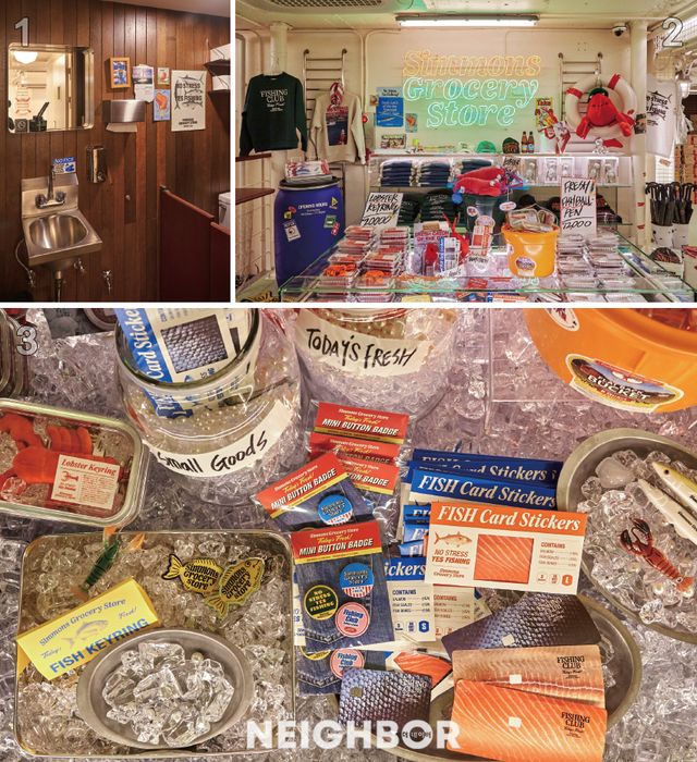 1 스윙도어를 설치하고 포토 스폿으로 꾸민 화장실. 2 2층의 굿즈 섹션. 의류, 문구, 인형 등 다양한 굿즈를 판매한다. 3 생선을 테마로 한 다양한 굿즈. 얼음 소품을 활용해 기발하게 전시했다.