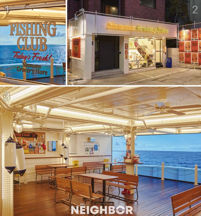 1 공간 콘셉트를 알리는 ‘피싱 클럽’ 로고. 2 신사동 가로수길 골목에 자리 잡은 시몬스 그로서리 스토어 신사 외관. 3 바다 영상으로 벽 한 면을 채운 1층 홀.