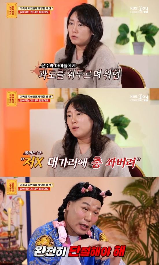 6일 방송된 KBS Joy '무엇이든 물어보살'(이하 '물어보살')에는 엄마와 남동생에게 돈을 뜯기고 남편, 친구, 변호사에게 배신을 당해서 살아가는 게 너무 힘들다는 사연자가 어렵게 입을 열었다.