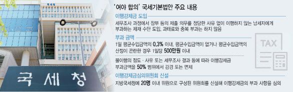 여야는 또한 이행강제금 부과사항을 심의하기 위해 지방국세청에 이행강제금심의위원회를 신설하는 내용을 법안에 새롭게 담았다. 위원장을 포함한 20명 이내 위원이 이행강제금 부과의 적절성을 따지도록 할 방침이다.