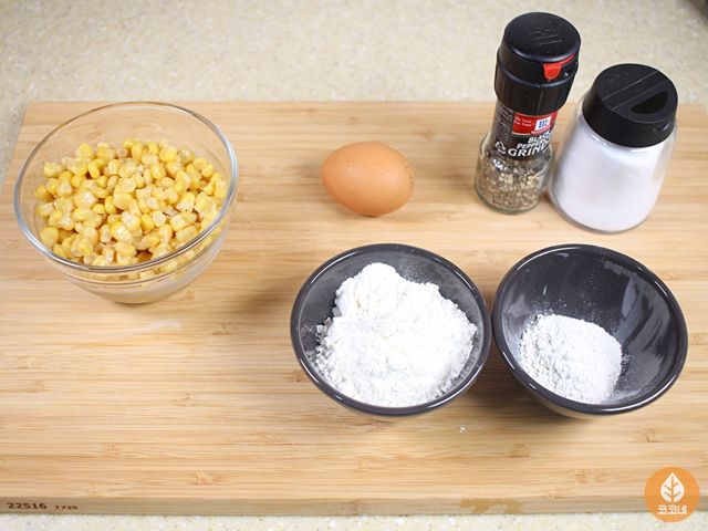 재료는 캔옥수수, 달걀, 밀가루, 튀김가루, 소금, 후추 준비했어요.