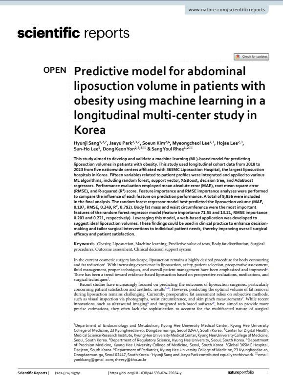‘지방흡입시 지방 추출량 예측 알고리즘 모델’에 관한 연구는 대상자의 체중, 나이 체지방량 등의 속성을 활용해 가장 이상적인 지방흡입 결과를 기대할 수 있도록 최적의 지방 추출량 예측에 관한 연구이다.