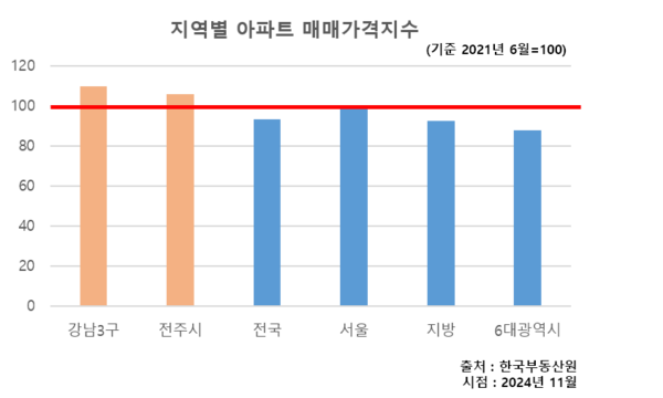 특히 전주시 아파트 매매가격지수는 서울 강남3구와 비슷한 수치를 나타내고 있다. 지난해 11월 기준 △서초구 113.0 △강남구 108.7 △송파구 108.2로 아파트 매매가격지수를 기록했다.