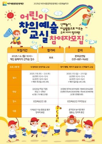 한편, 시민예술학교 '어린이 창의예술 교실'은 오는 12일부터 2월 9일까지 매주 토요일과 일요일에 진행되며, 이번 교육을 포함한 재단의 다양한 문화예술교육 및 공연 등의 자세한 정보는 재단 홈페이지에서 확인하면 된다.