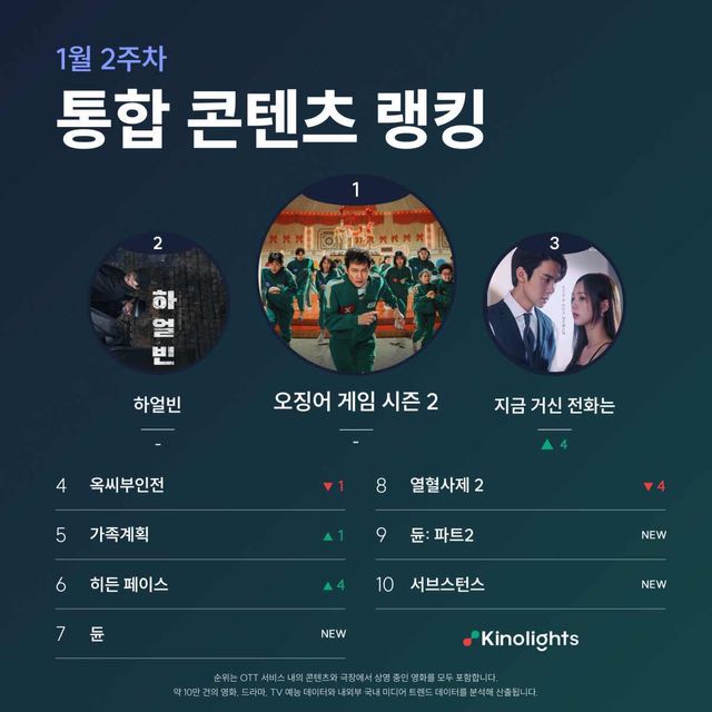 OTT 콘텐츠 통합 검색 플랫폼 키노라이츠가 1월 2주차(12/30~1/5) 통합 콘텐츠 랭킹을 공개했다. / 키노라이츠 제공
