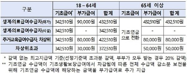 이는 전년도 선정기준액(단독가구 130만 원, 부부가구 208만 원) 대비 단독가구는 8만 원, 부부가구는 12만 8000원 인상한 금액이다.
