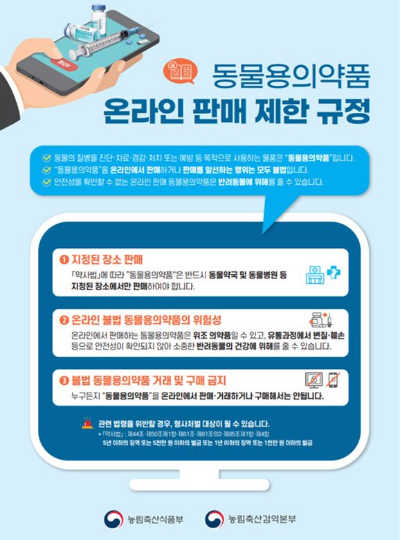 동물용 의약품은 반드시 동물병원, 동물약국 등 지정된 장소에서만 전문가가 팔아야 한다. 위반하면 약사법에 따라 형사처벌(최대 5년 이하 징역 또는 5000만 원 이하 벌금) 받는다.