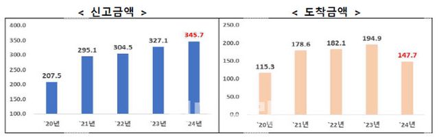 최근 5년간 신고금액을 살펴보면 △2020년 207억 5000만달러 △2021년 295억 1000만달러 △2022년 304억 5000만달러 △2023년 327억 1000만달러로 꾸준한 증가세를 보이고 있다.