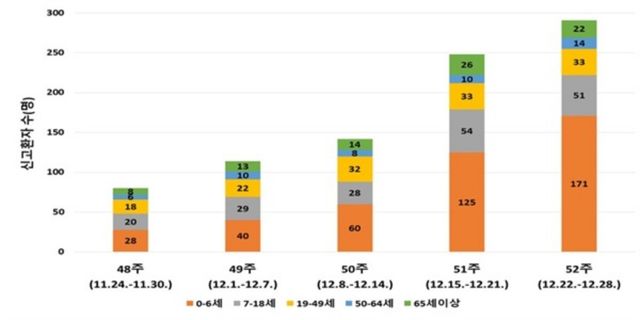 환자 수는 지난해 48주(11월 24일∼30일) 80명에서 49주(12월 1일∼7일) 114명, 50주(12월 8일∼14일) 142명, 51주(12월 15일∼21일) 247명으로 증가세를 보이고 있다.