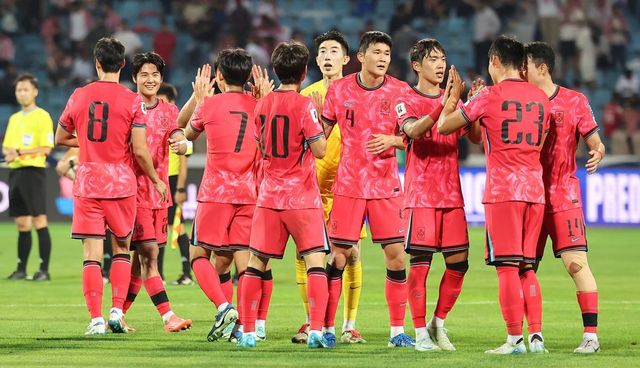 2024년 10월 10일(현지시간) 요르단 암만 국제경기장에서 열린 2026 국제축구연맹(FIFA) 북중미 월드컵 아시아 3차 예선 B조 3차전 대한민국과 요르단의 경기에서 2-0으로 승리를 거둔 대한민국 선수들이 하이파이브를 하고 있다 / 뉴스1