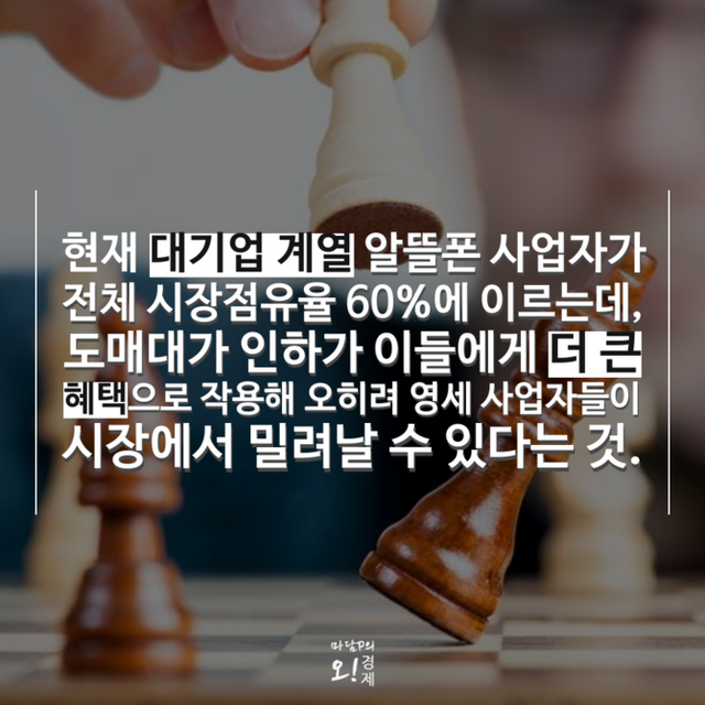 현재 대기업 계열 알뜰폰 사업자가 전체 시장점유율의 60%에 이르는데, 도매대가 인하가 오히려 이들에게 더 큰 혜택으로 작용해 영세 사업자들이 시장에서 밀려날 수 있다는 것.