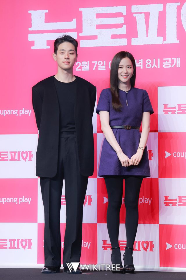 7일 오전 콘래드 서울 그랜드볼룸에서 '뉴토피아' 제작발표회가 진행됐다. 제작발표회에 참석한 배우 박정민, 지수가 포즈를 취하고 있다.