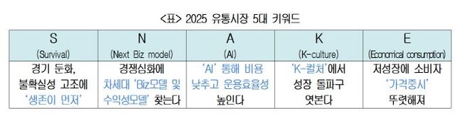 대한상의는 7일 이같은 내용이 담긴 ‘2025 유통산업 백서’를 발간했다. S는 생존(Survival), N은 차세대 비즈니스 모델(Next Biz model), A는 인공지능(AI), K는 K컬처(K-Culture), E는 가격 중시 소비 트렌드(Economical consumption)를 의미한다.