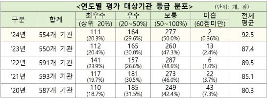 기관별 평가 등급을 보면 상위 20%인 ‘최우수’가 111곳, 20~50%인 ‘우수’가 164곳, 50~100%인 ‘보통’이 277곳이었다. 60점 미만에 해당하는 ‘미흡’은 2곳으로, 전년(13곳)보다 줄었다.