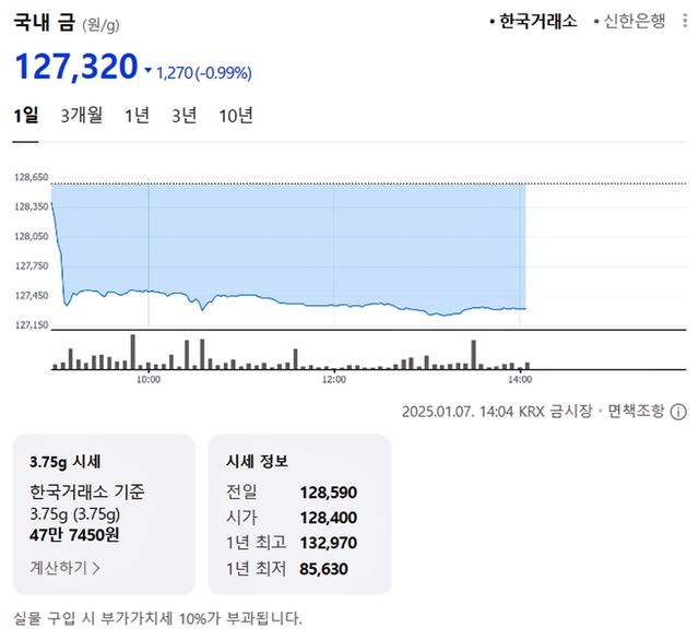 국내 금시세(금값)가 7일 오후 하락세(전 거래일 대비)를 보이고 있다.