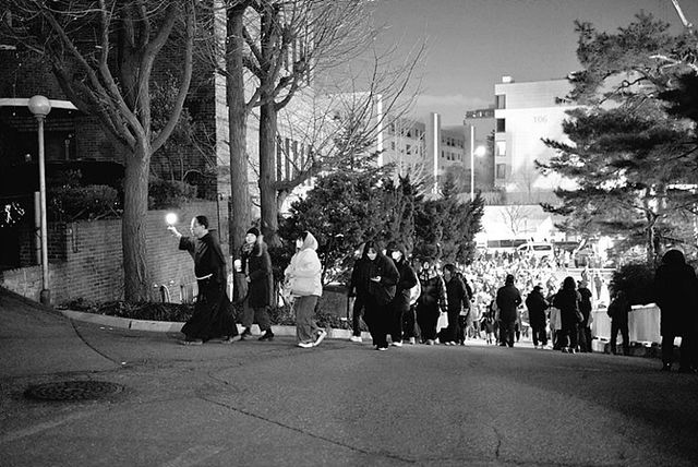 사진 속에는 검은색 수도사 복장을 한 신부가 오른손에 밝게 빛나고 있는 BTS 응원봉인 ‘아미봉’을 들고 앞서 걸으며 집회에 참여한 시민들에게 길을 안내하는 모습이 담겼다.