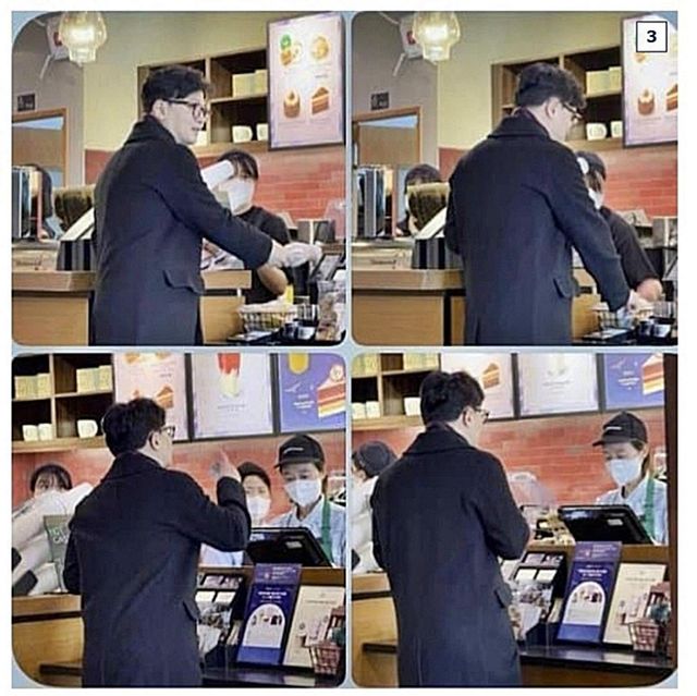한동훈 전 국민의힘 대표가 사퇴하고서 첫 목격담이 나왔다. 사진은 강남 스타벅스에서 목격된 것으로 전해진 한동훈 전 국민의힘 대표. /네이버카페 '위드후니' 캡처
