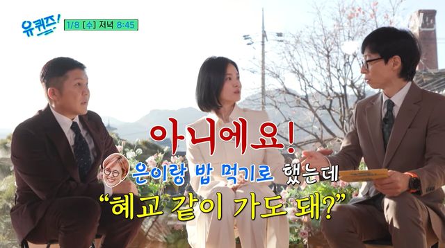 유재석은 "기억한다. (송)은이가 저랑 친구니까 밥을 먹자고 했는데 '혜교 같이 가도 돼?' 해서 잠깐 봤다"고 이야기했는데, 송혜교는 "아니에요"라고 부인했다.