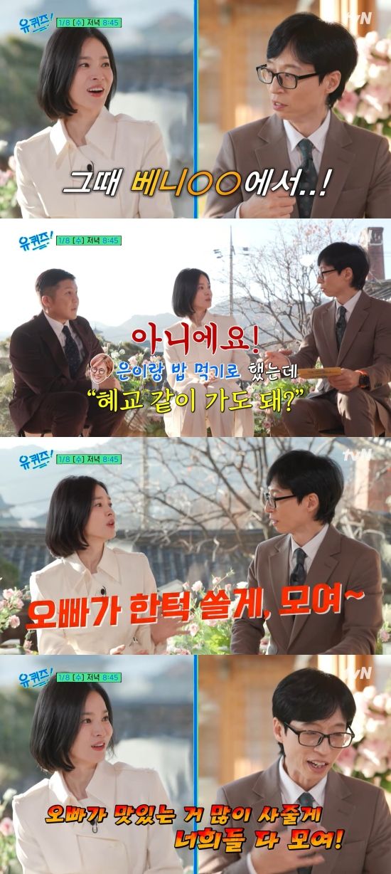 7일 오후 '유 퀴즈 온 더 튜브' 유튜브 채널에는 '25년 전, 큰 자기와 송혜교 자기님의 ’베니건스에서 생긴 일(?)‘'이라는 제목의 선공개 영상이 게재됐다.