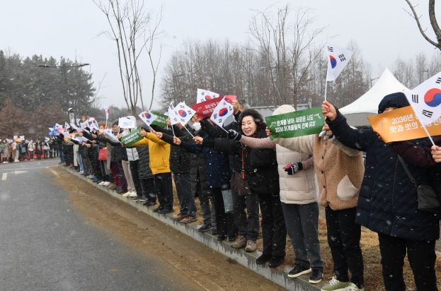 7일 500여 명의 완주군 주민들이 매서운 추위를 뚫고 완주 테니스장 앞에서 하계올림픽 현장 평가단을 환영했다.
