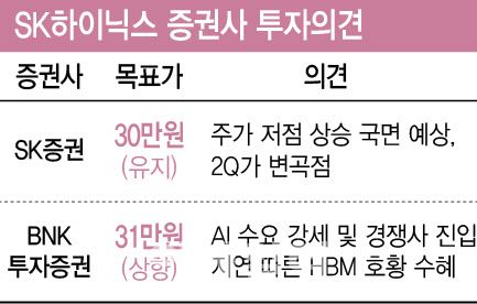 증권가의 눈높이도 높아지고 있다. 20만원선 돌파가 임박한 가운데 실적 전망이 긍정적인 만큼 30만원대도 가능하다는 전망이 나온다. 반도체 업황 사이클에 대한 불안요소가 있긴하나 실적 우상향을 기대해 볼만하다. HBM 호황의 직접 수혜가 기대된다는 이유다. SK증권은 SK하이닉스의 목표가를 30만원으로 유지했으며 BNK투자증권은 31만원으로 상향했다.