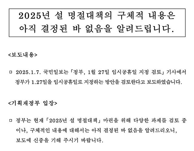 2025년 1월 27일 임시공휴일 지정 검토 보도와 관련해 정부는 7일 기획재정부 명의로 낸 입장문에서 "정부는 현재 '2025년 설 명절 대책' 마련을 위해 다양한 과제를 검토 중이나 구체적인 내용에 대해서는 아직 결정된 바 없음을 알려드린다"라고 밝혔다. / 기획재정부 제공