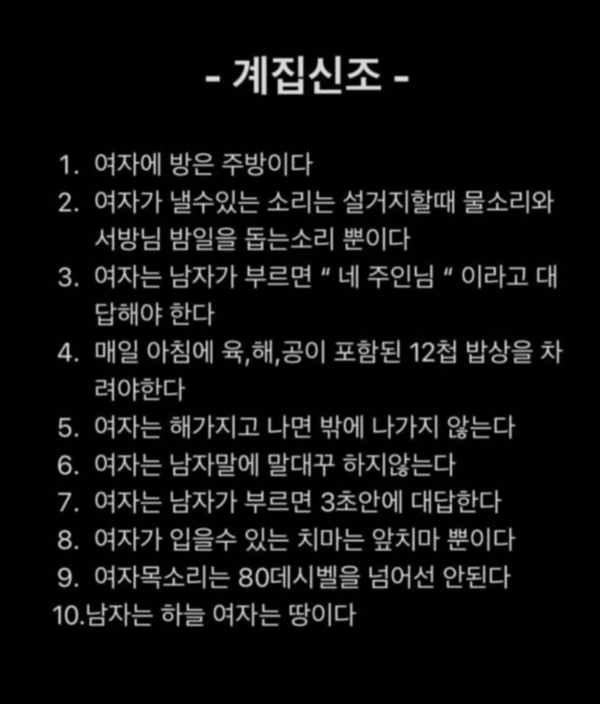 SNS를 통해 빠르게 확산된 "계집신조"는 여성을 남성보다 열등한 존재로 규정하고, 여성의 행동을 제한하는 내용을 담고 있다.