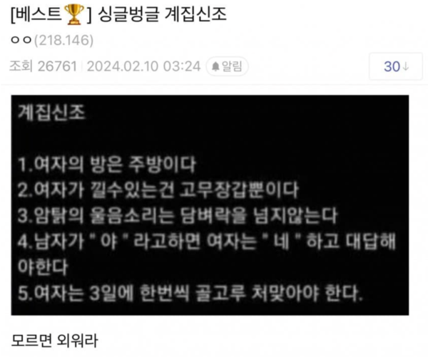 이 글은 여성에 대한 차별적 규범을 정리한 것으로, "여자는 주방에 있어야 한다"거나 "여자는 남자가 부르면 3초 안에 대답해야 한다"는 식의 내용을 담고 있다. 이러한 내용은 과거 남초 커뮤니티에서 사용되던 혐오 표현을 SNS와 청소년 문화로 끌어온 것이다.